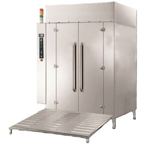 弘翔机械的这一款推入式高温消毒清洗机、烤盘﹑模具烤盘﹑盘架车﹑桶车和容器清洗机 具有多种款式和容量。这些清洗机安装在坑中或与坡道或手推车一起使用,配有特殊的“推入式“清洗架,这些清洗架是标准的或根据您的需要定制设计的。您也可以清洗空烤箱置物架或相关车架。